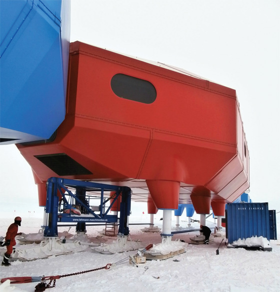 The red module pictured weighs 220 tonnes. The modules are fitted with hydraulic legs that can be raised to ensure that the station is not buried under annual snowfall.